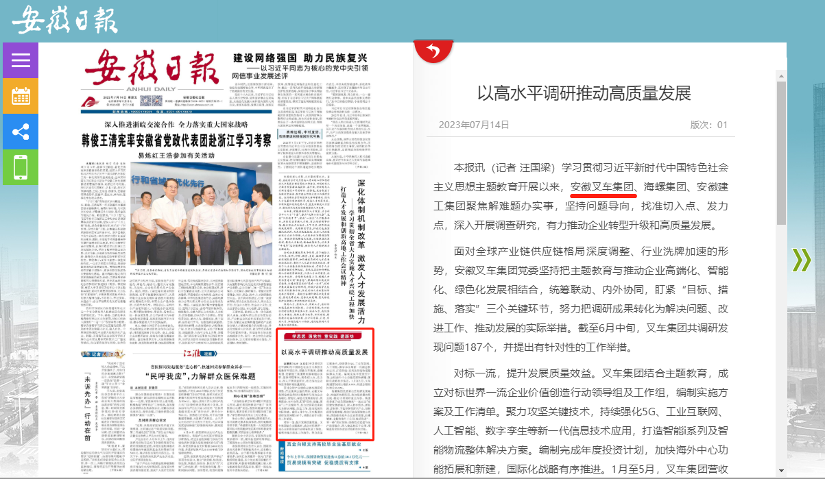 7月14日,《安徽日?qǐng)?bào)》在頭版中就安徽叉車(chē)集團(tuán)以高水平調(diào)研推動(dòng)高質(zhì)量發(fā)展情況進(jìn)行了報(bào)道。報(bào)道中表示,學(xué)習(xí)貫徹習(xí)近平新時(shí)代中國(guó)特色社會(huì)主義思想主題教育開(kāi)展以來(lái),安徽叉車(chē)集團(tuán)聚焦解難題辦實(shí)事,堅(jiān)持問(wèn)題導(dǎo)向,找準(zhǔn)切入點(diǎn)、發(fā)力點(diǎn),深入開(kāi)展調(diào)查研究,有力...