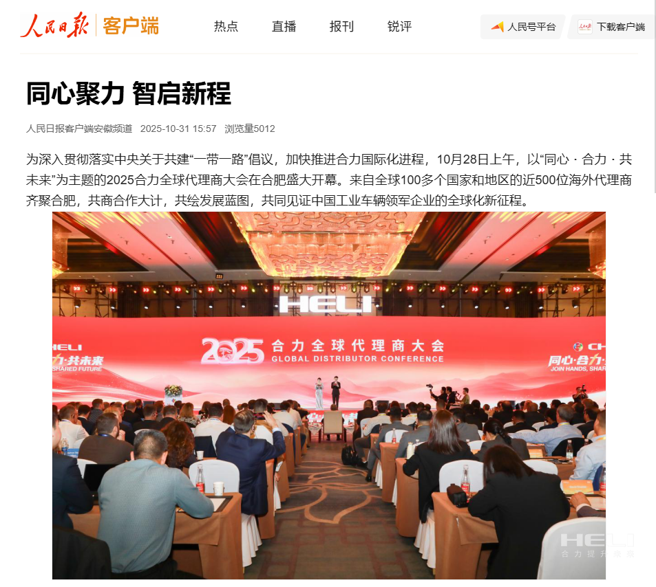 10月28日至31日,“同心?合力?共未來(lái)”2025合力全球代理商大會(huì)在合肥召開,引發(fā)媒體廣泛關(guān)注,新華社安徽分社、中央廣播電視臺(tái)安徽總站、經(jīng)濟(jì)日?qǐng)?bào)、證券日?qǐng)?bào)、央廣網(wǎng)、中國(guó)工業(yè)報(bào)、人民網(wǎng)安徽頻道、新華網(wǎng)安徽頻道、安徽日?qǐng)?bào)、安徽新聞聯(lián)播等28家媒體、46名記...
