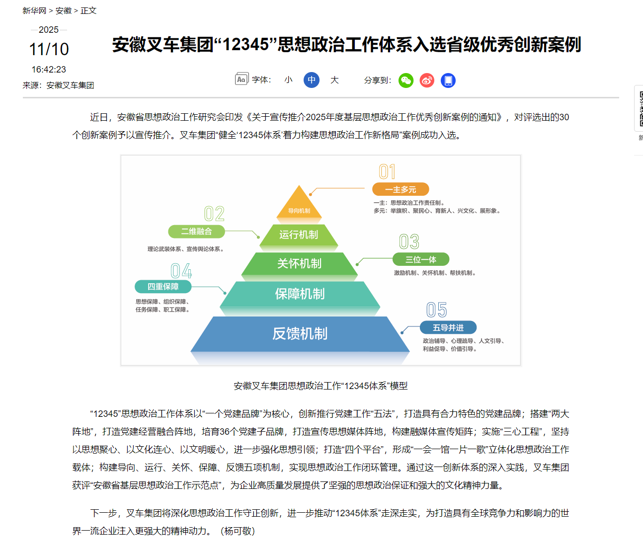 近日,安徽省思想政治工作研究會(huì)印發(fā)《關(guān)于宣傳推介2025年度基層思想政治工作優(yōu)秀創(chuàng)新案例的通知》,對(duì)評(píng)選出的30個(gè)創(chuàng)新案例予以宣傳推介。叉車集團(tuán)“健全‘12345體系’著力構(gòu)建思想政治工作新格局”案例成功入選。 “12345”思想政治工作體系以“一個(gè)黨建...